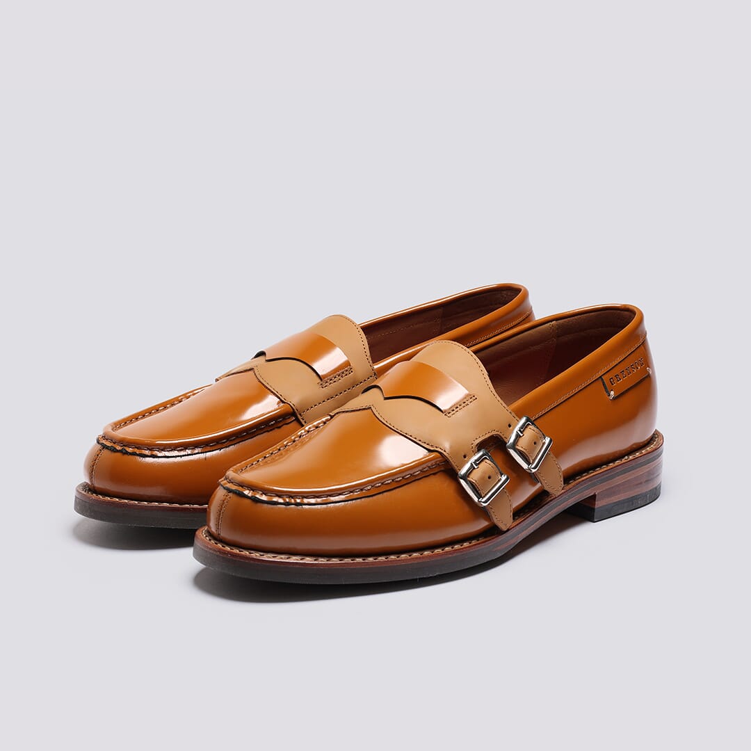 The upper contrasts polished tan gloss with tonal rubberised leather. Steven has a leather sole with rubber grips and is Goodyear welted.