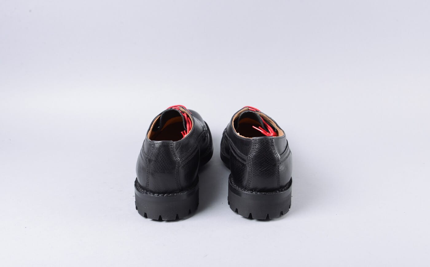 Veldtschoen translates literally as Bush-Shoe. This Grenson Veldt mens derby shoe has been made using black Russian Reindeer leather with a hardwearing commando sole.